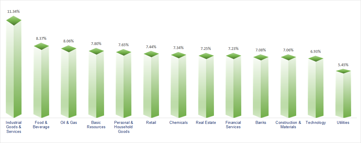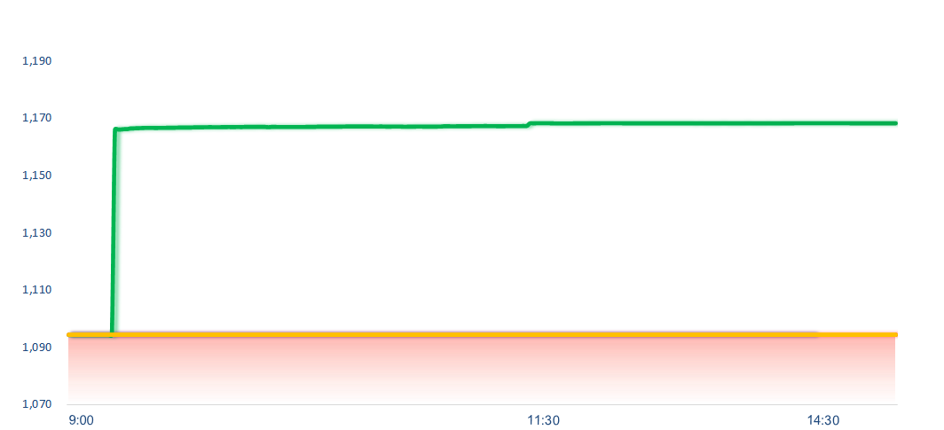 VN-Index made a dramatic reversal, with nearly the entire market shifting from floor-limit losses to ceiling-limit gains. A sea of "purple" — the color indicating limit-up — blanketed all sectors. Industrial Goods & Services and Food & Beverage were the two strongest-performing sectors in terms of index gains.