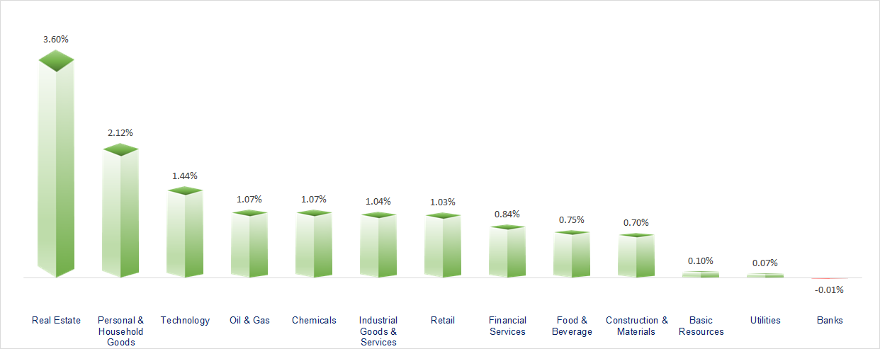 VNIndex có phiên tăng điểm tích cực khi tâm lý thận trọng của nhà đầu tư dần được nới lỏng. Bất động sản, Công nghệ thông tin và Dầu khí là những nhóm tích cực nhất ngày hôm nay. Trái lại, Ngân hàng là nhóm ngành tiêu cực duy nhất.