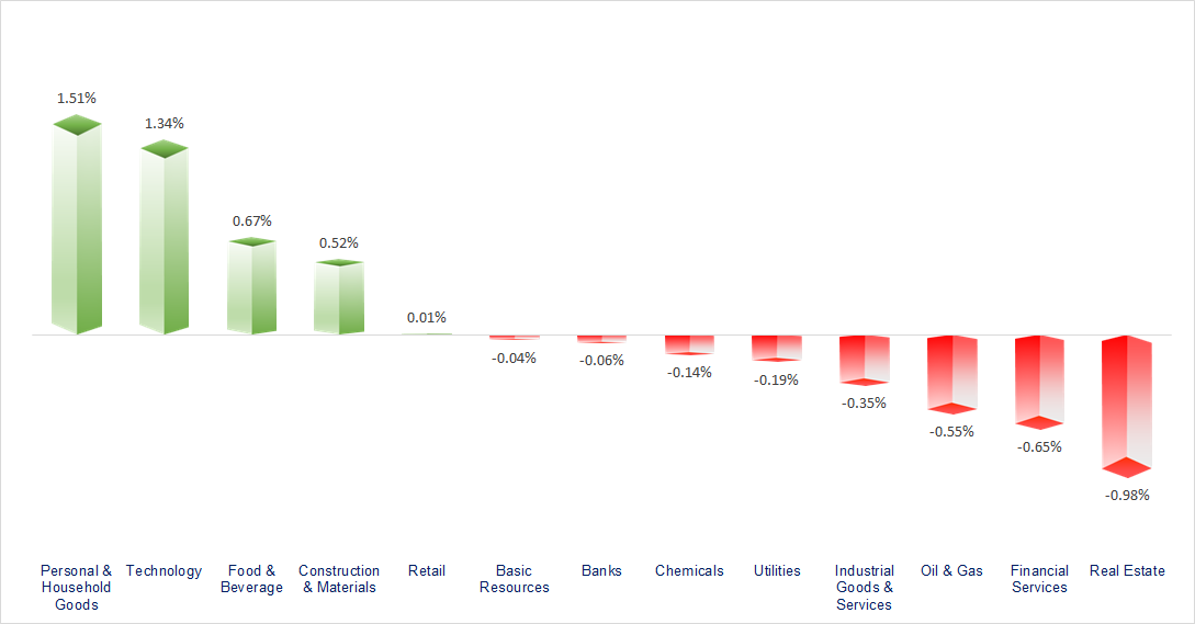 VN-Index declined as investors awaited new information regarding tariff negotiations. Technology and Retail were the best-performing sectors in today's session, while Insurance, Real Estate, and Securities recorded the most negative movements.