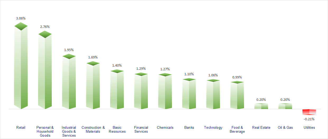 VN-Index continued its upward momentum with liquidity surpassing USD1 billion, and foreign investors recorded their strongest net buying in the past month. Most sectors gained during today’s session, with notable performance from the Retail Services and Industrial Goods & Services sectors.