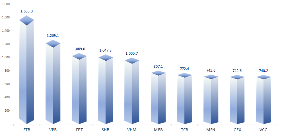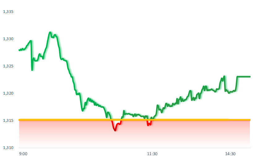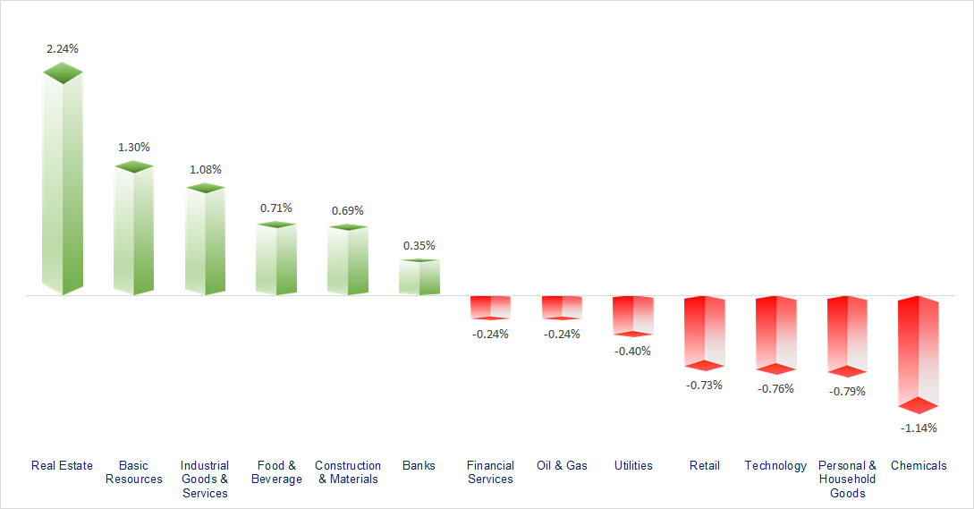 VN-Index fluctuated strongly within a wide range around its previous peak. Real estate and natural resources were the most impressive gainers in today’s session. In contrast, the telecommunications and chemicals sectors showed less favorable performance.