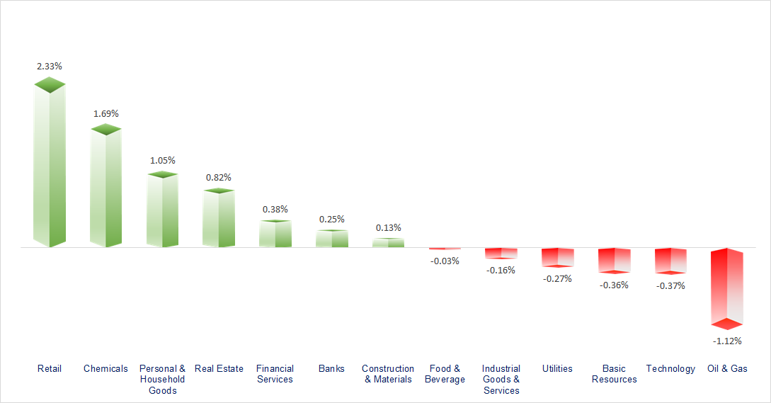 VN-Index had a technical rebound as investors anticipated a positive outcome from the U.S.-China negotiations. The market showed strong divergence today, with the most positive sectors in the green being Retail, Chemicals, and Construction Materials. On the contrary, Oil & Gas, Steel, and some Real Estate stocks were rather subdued.