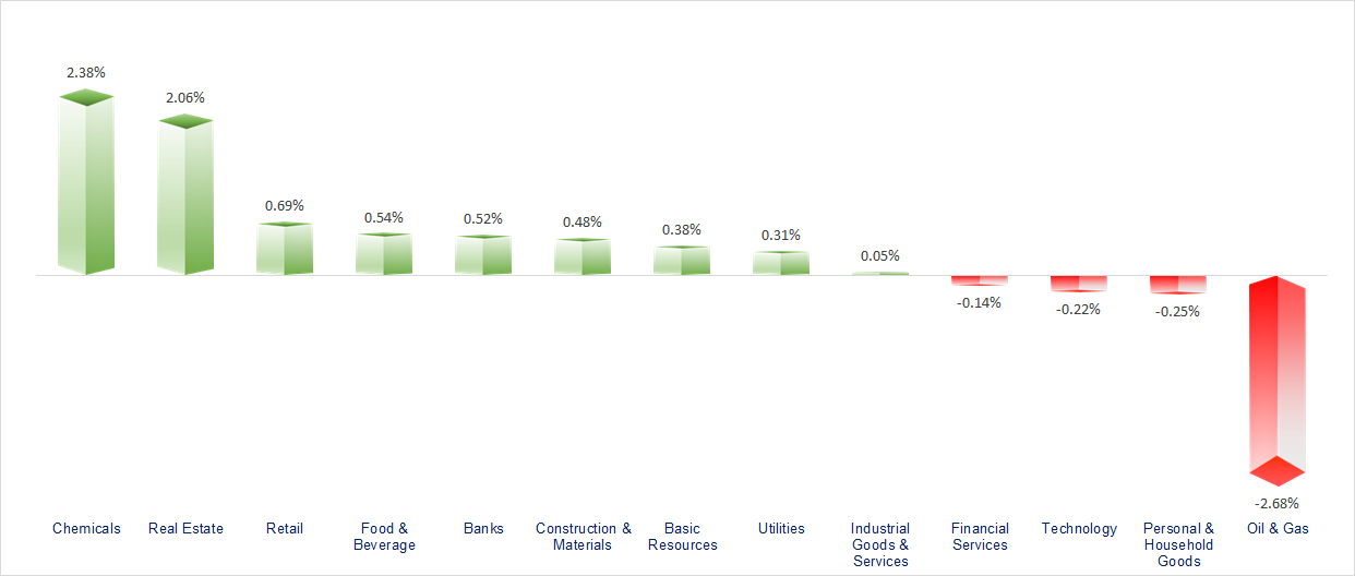 VN-Index surged into the green as capital flows returned, fueling a rally in real estate stocks. Chemicals and Real Estate were the two most positively performing sectors in today’s session. In contrast, Oil & Gas and Technology underperformed.