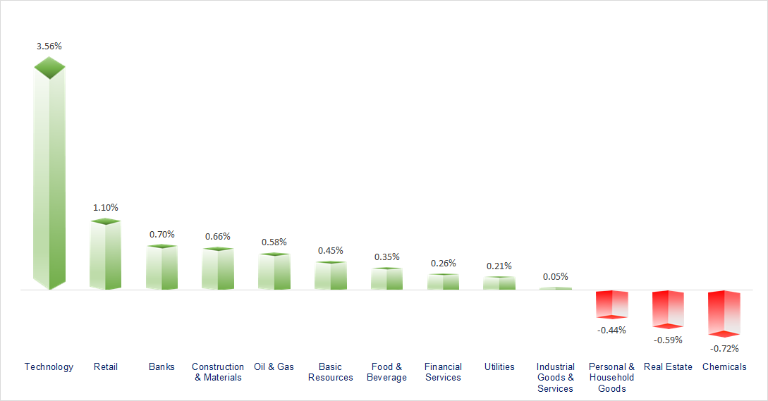 VN-Index rebounded thanks to strong net buying of over VND 1,800 billion from foreign investors. Technology, Insurance, and Telecommunications were the top-performing sectors today. In contrast, Chemicals and Real Estate showed less optimistic performance.