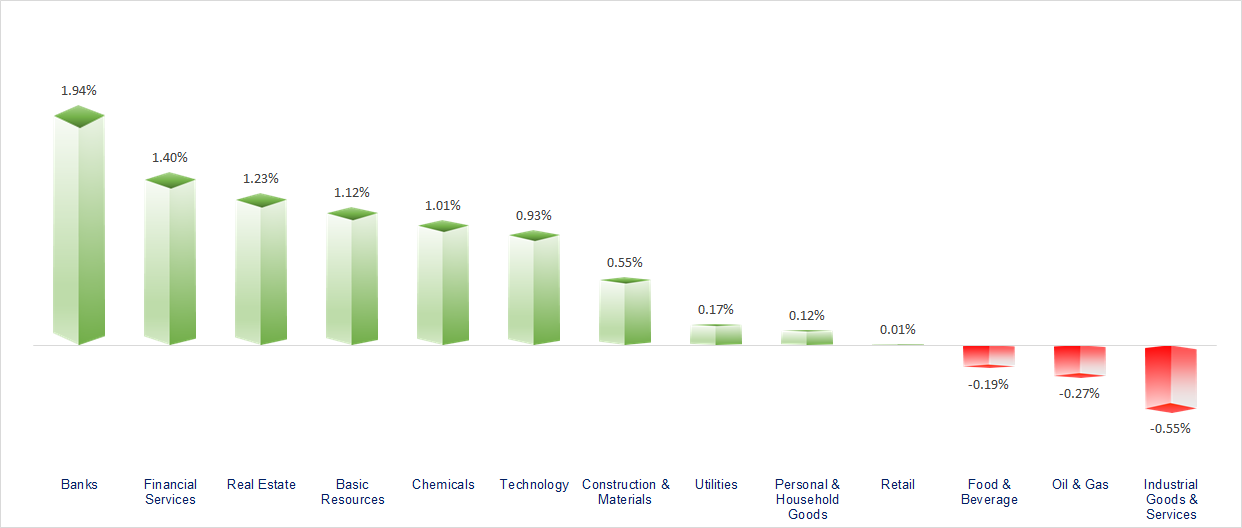 VN-Index staged a follow-through breakout session and officially surpassed the 1,400-point mark. Banking, Securities, and Real Estate were the most positive-performing sectors today. In contrast, Oil & Gas and F&B showed less favorable movements.