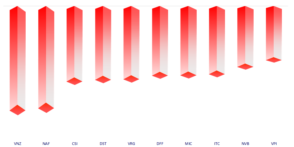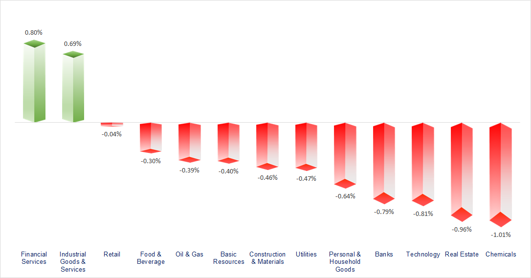 VN-Index recorded its first distribution session after a continuous gain of over 88 points. Most sectors declined today, except for Securities, Commodities, and Industrial Services, which showed positive performance.