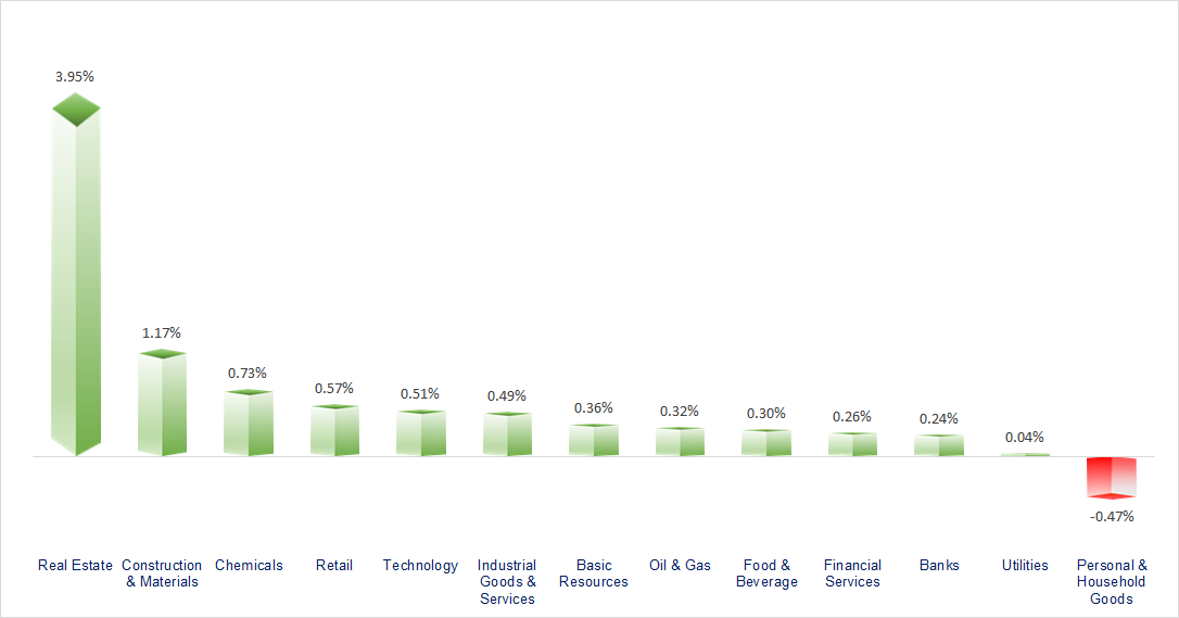 VN-Index continued its rally today with total trading value across all three exchanges exceeding VND42 trillion. Most sectors closed higher, with the Real Estate group standing out as the strongest performer.
