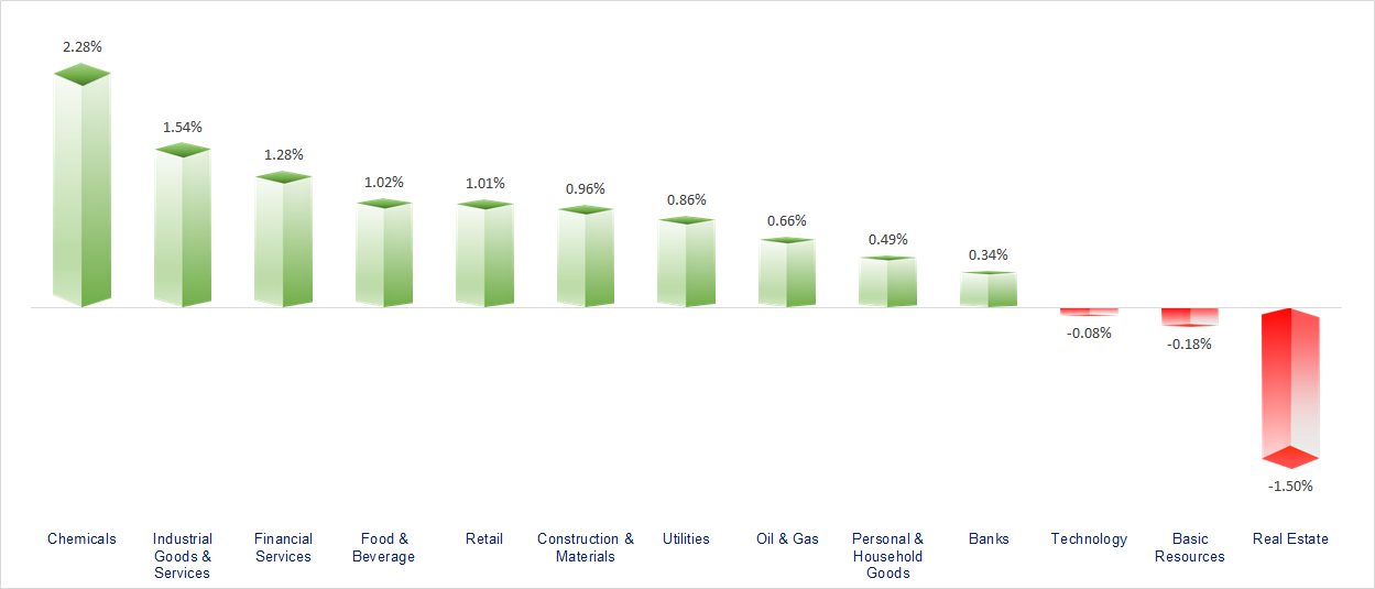 VN-Index experienced a highly emotional trading session with liquidity exceeding USD 1.6 billion. Most sectors saw strong gains, with Chemicals and Securities standing out as the top performers.