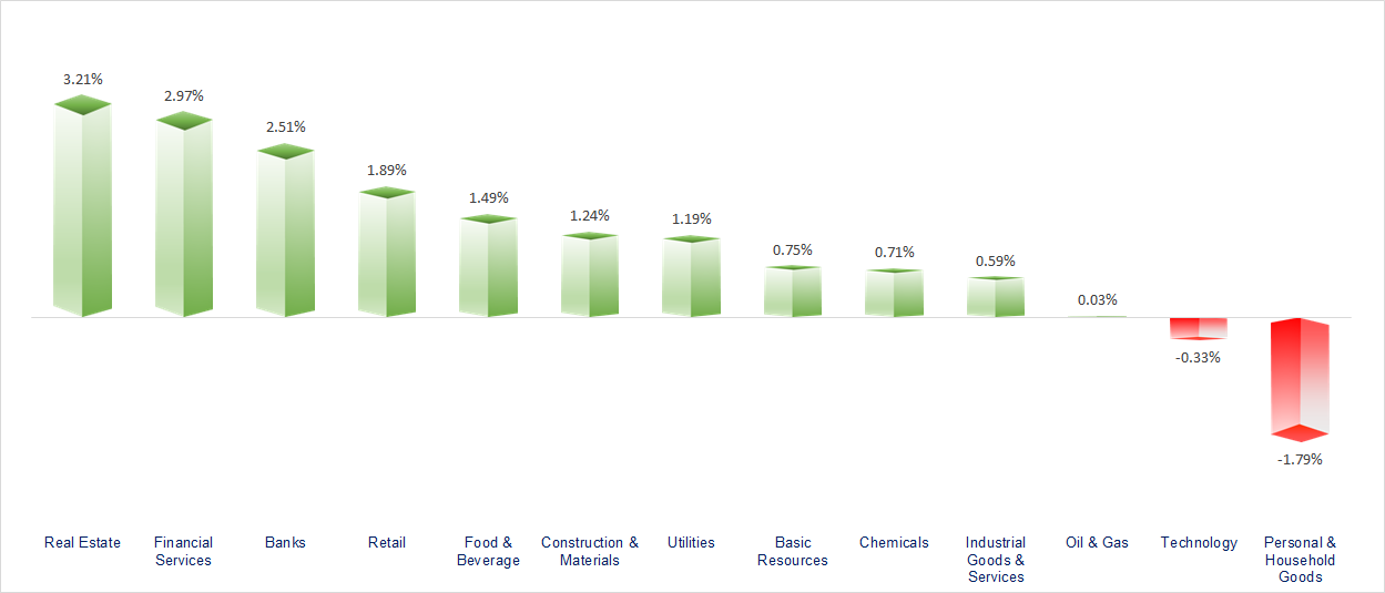 VN-Index rebounded by more than 30 points despite strong net selling of over VND10,000 billion from foreign investors. Most sectors posted positive gains, with Real Estate and Securities standing out the most. In contrast, Personal & Household Goods and Technology saw rather lackluster performance.