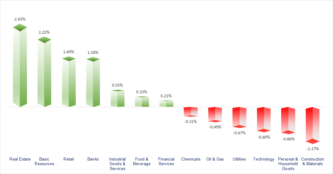 VN-Index experienced strong volatility with a trading range of up to 65 points, accompanied by a record-high liquidity of nearly VND86 trillion. The Real Estate, Resources, and Banking sectors were the most positive performers in today’s session, while Technology and Construction & Materials sectors showed rather lackluster movements.
