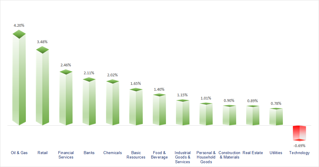 VN-Index continued its strong rally today, surging over 26 points with robust market-wide cash flow. Oil & Gas, Retail, and Securities were the best-performing sectors of the session. In contrast, the Technology group showed rather lackluster performance.