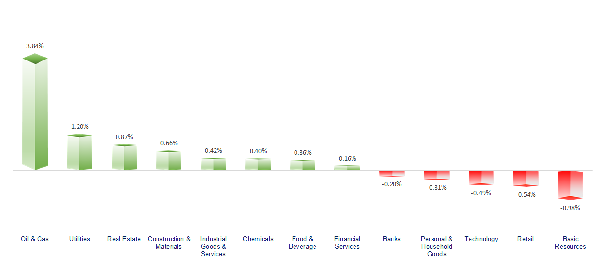 VN-Index continued to hit a new all-time high today despite intraday volatility. Oil & Gas, Real Estate, and Construction were the standout gainers, while Resources and Retail saw less favorable movements.