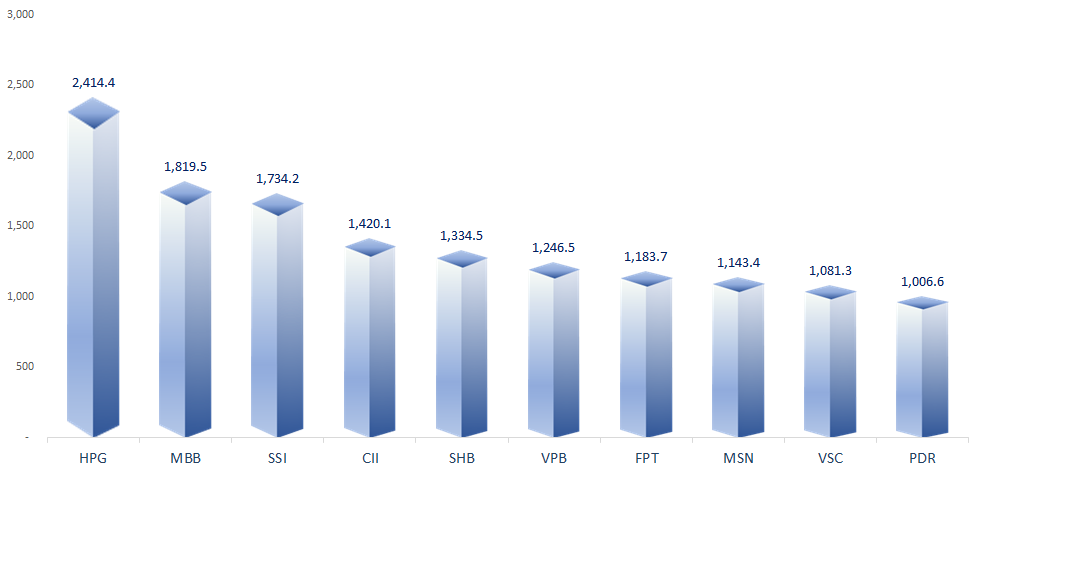 Một số cổ phiếu tăng điểm đáng chú ý khác có thể kể tới như VJC +2.4%, HHS +3.1%, TLG +2.7%, BCM +1.1%, EVF +3.6%, FPT +1%, HUT +2.2%,…