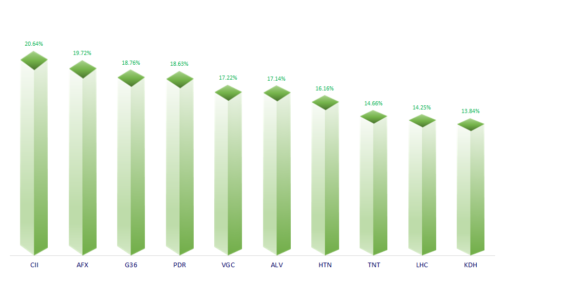 Dòng tiền hôm nay còn xoay tua sang nhóm cổ phiếu Đầu tư công với 1 số cái tên nổi bật như CII và DHA đóng trần, HT1 +4.6%, HHV +2.7%, VLB +0.4%,… Hôm nay DHA chính thức vượt đỉnh lịch sử với thanh khoản cao hơn gấp 2 lần phiên trước với khoảng 0.3 triệu cổ.