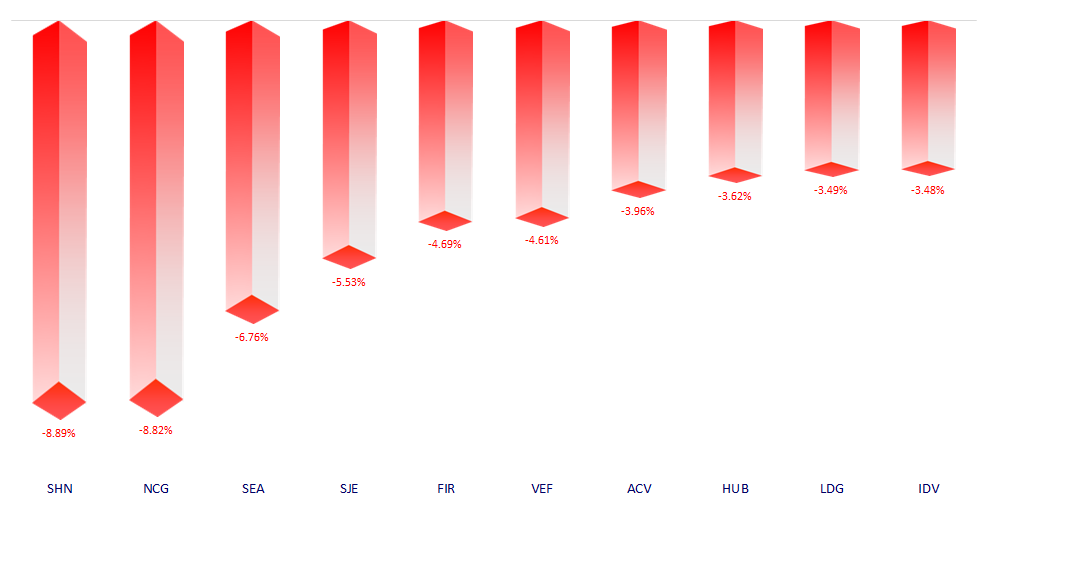 Một số cổ phiếu giảm điểm đáng chú ý khác có thể kể tới như NVL -1.6%, YEG -1%, VEF -2.1%, HBC -2.3%, IJC -2.1%, NTP -1.1%, MSR -1.4%, MML -2.5%, VPI -1.7%,..