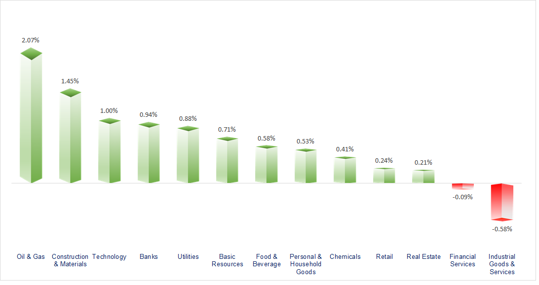 Nhóm Bán lẻ cũng có diễn biến khá tích cực với PET +2.4%, DGW +1.8%, PNJ +1.2%, MWG +0.1%,…