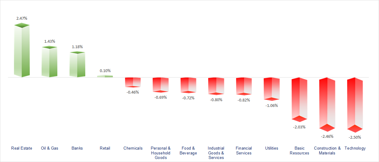 VN-Index closed up more than 10 points today despite having fallen over 40 points at one stage during the session. Oil & Gas, Banking, and Real Estate were the leading gainers, while Technology, Construction, and Resources stocks underperformed.