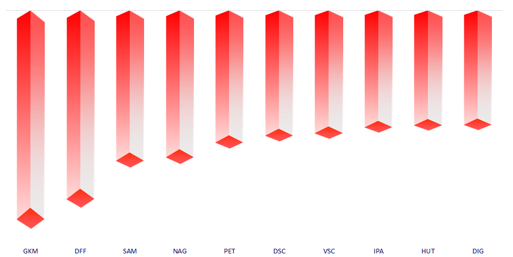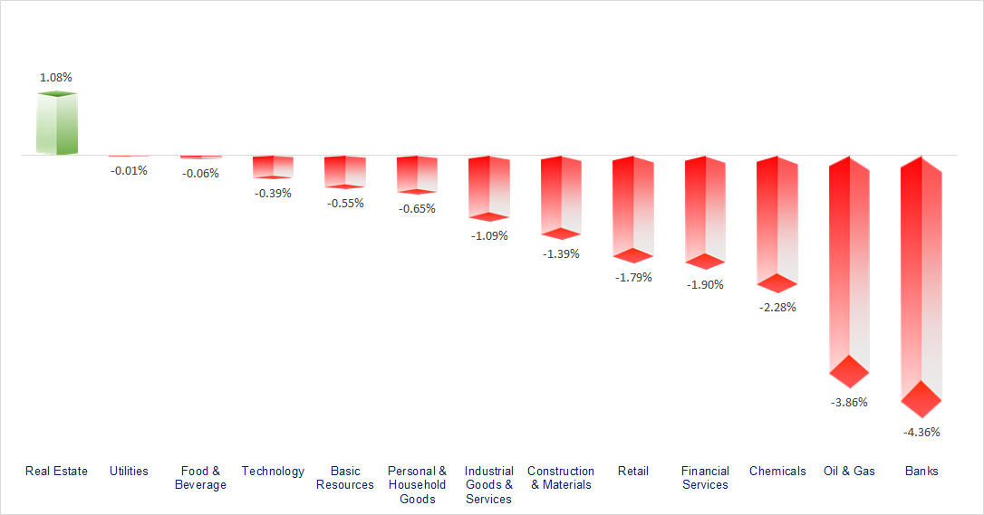VN-Index posted a second consecutive sharp decline, pressured by the banking sector as many bank stocks hit their floor prices. Most sectors closed lower today, except for the Vingroup-related group and the insurance sector, which showed relatively positive performance.
