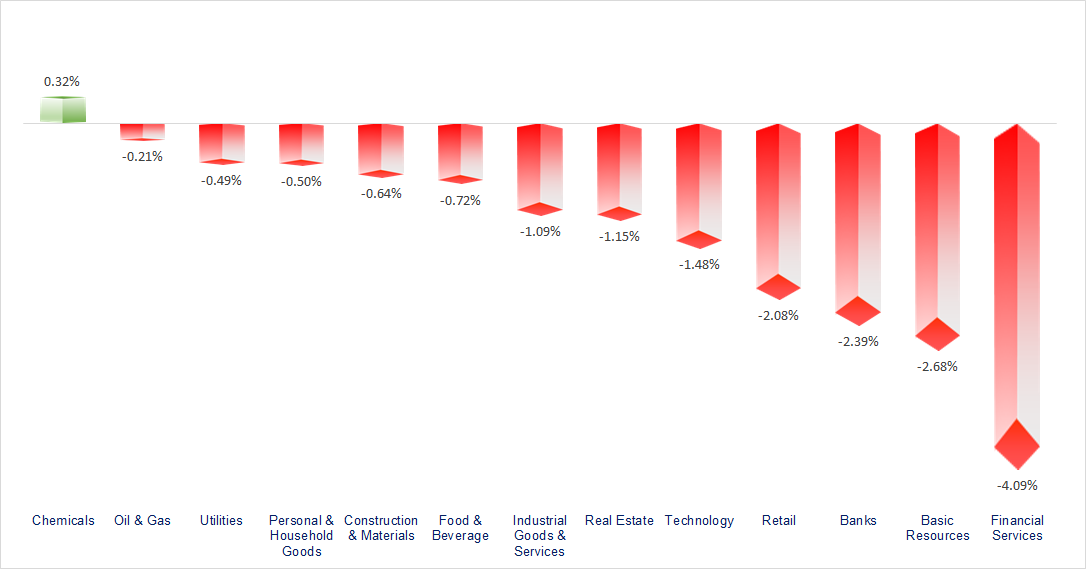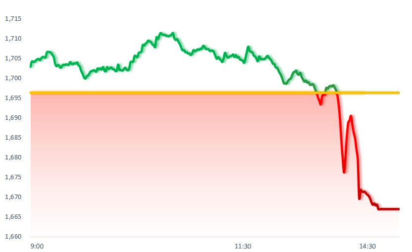 VN-Index unexpectedly reversed course, dropping more than 40 points after surpassing the 1,700 mark. Most sectors surprisingly declined today despite a fairly positive start, with the worst-performing industries including Securities, Resources, Banking, and Retail.