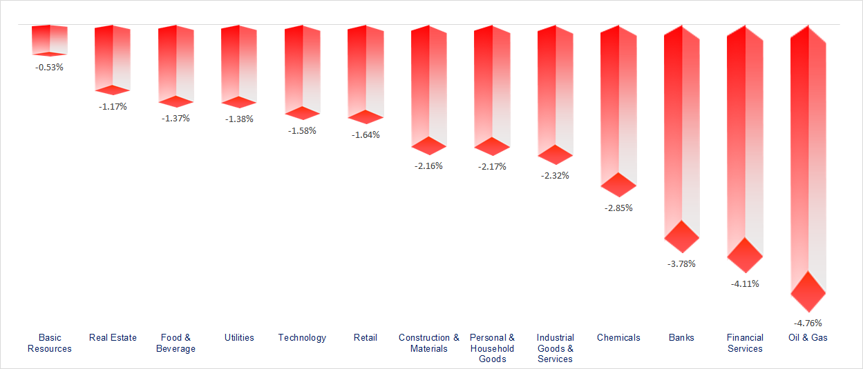 VN-Index unexpectedly plunged more than 30 points in just the last 20 minutes of trading. Most sectors closed lower today, with Oil & Gas, Securities, Banking, and Chemicals among the hardest hit.