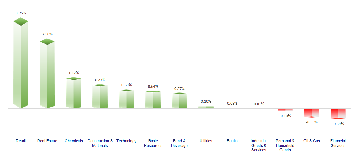 VN-Index staged a dramatic reversal in the afternoon session, bouncing back to close with a gain of more than 50 points, driven largely by large-cap stocks. Retail, Real Estate, and Chemicals were the standout performers, while Securities and Oil & Gas lagged behind.