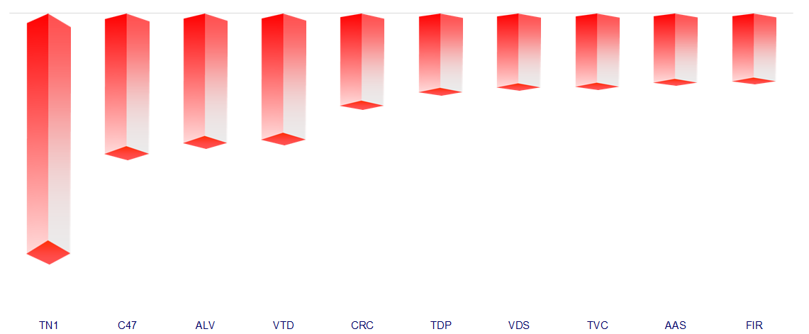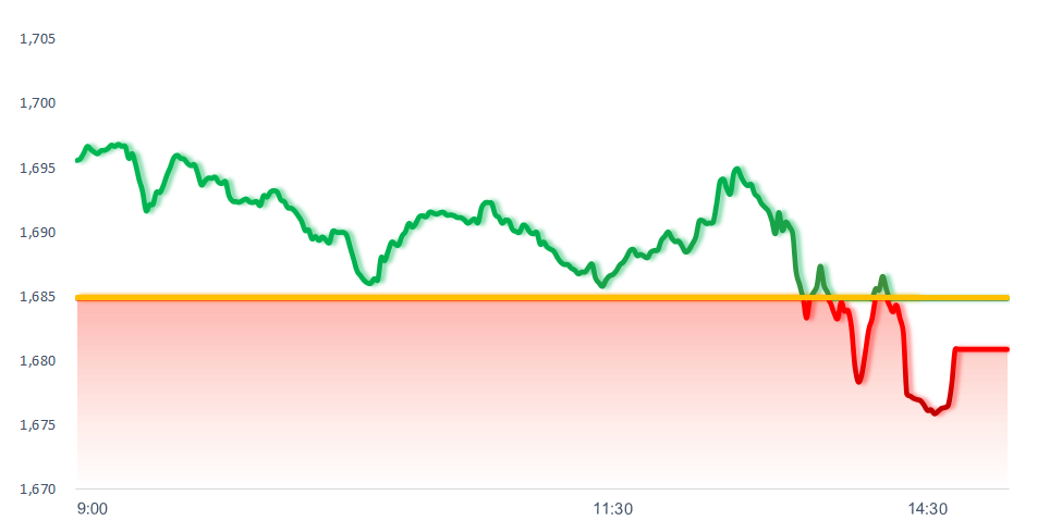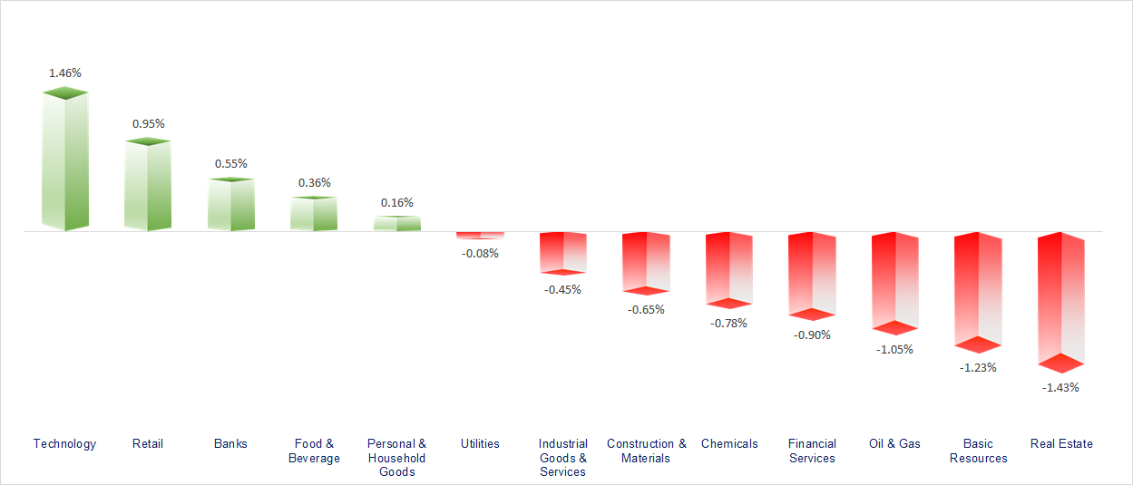 VN-Index fell sharply in the afternoon session, despite opening with a gap of more than 10 points. Among sectors, Technology, Retail, and Banking recorded gains today, while Real Estate, Resources, and Oil & Gas remained lackluster.