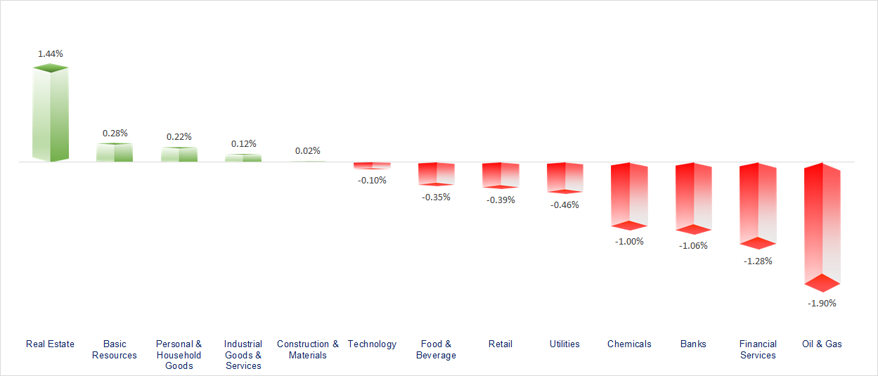VN-Index unexpectedly rebounded by more than 17 points as VIC shares surged during the ATC session. Real Estate and Resources were the most positive sectors of the day, while Securities, Oil & Gas, and Banking stocks performed rather weakly.
