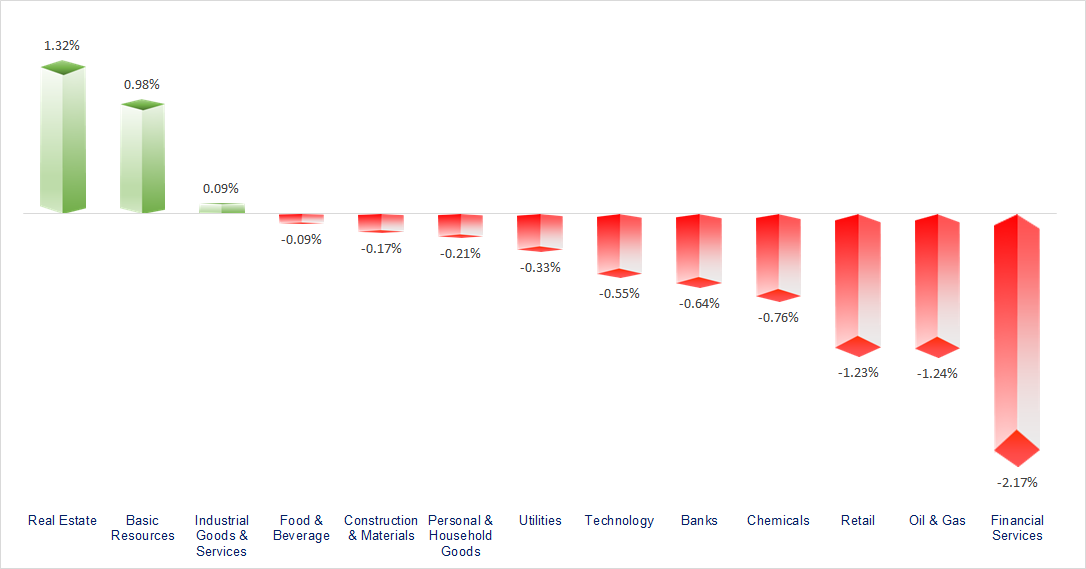 VN-Index experienced strong volatility in the afternoon session, with continued selling pressure on banking stocks. Many sectors declined today, with noticeable negative performance in Securities, Oil & Gas, and Retail. In contrast, the Real Estate and Resources sectors showed relatively positive movements.