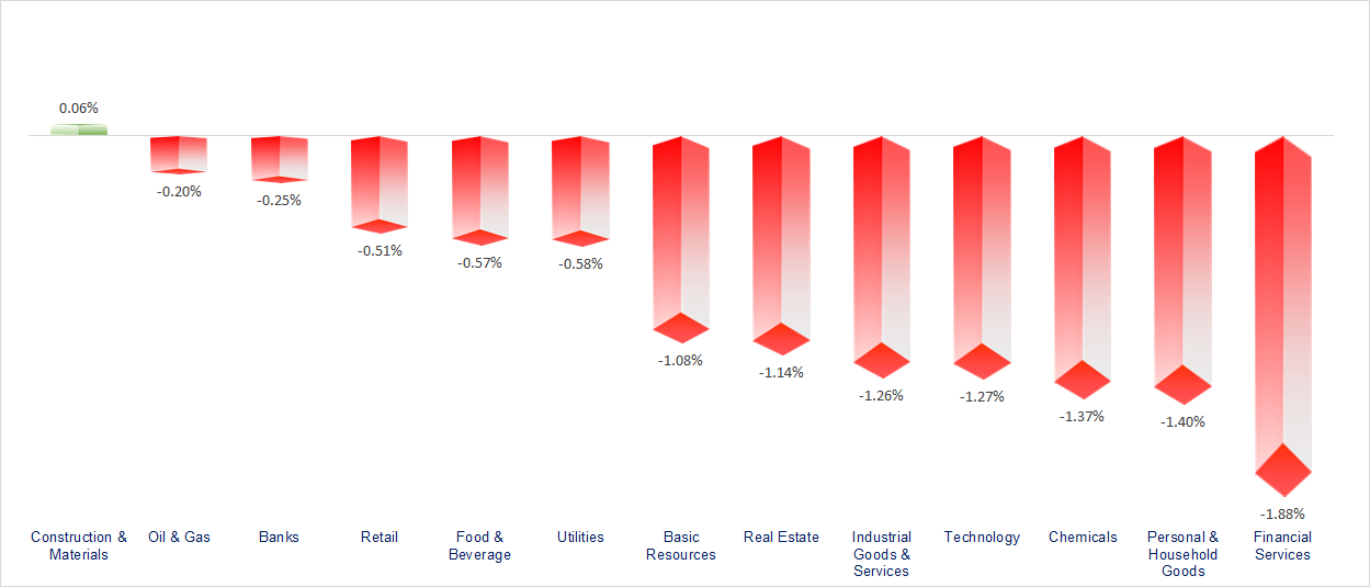 VN-Index broke below its 20-day moving average (MA20) as liquidity dried up and foreign investors recorded strong net selling of more than 2,400 billion VND. Most sectors declined today, with the most notable weakness coming from Securities, Chemicals, and Technology stocks.