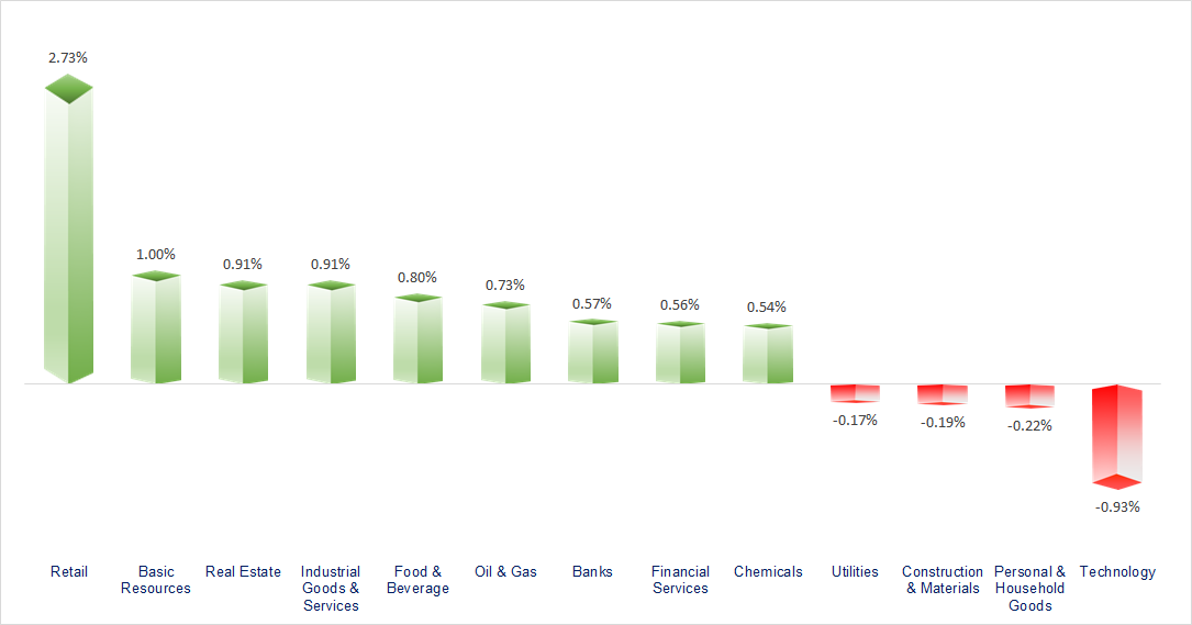 VN-Index sharply retreated in the afternoon session as the Vietnamese stock market was officially upgraded by FTSE from a frontier market to a secondary emerging market. Almost all sectors recorded positive gains today, with Real Estate, Securities, and Resources being the most notable.