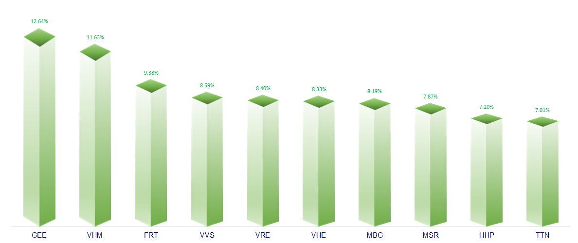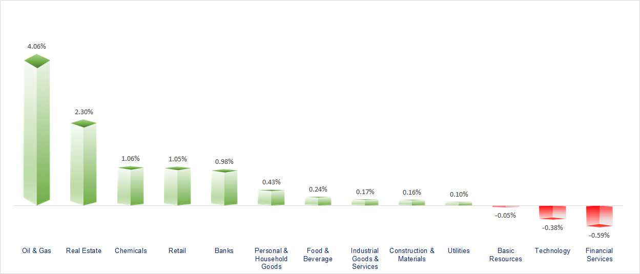 VN-Index reached a new all-time high today as capital flowed strongly into Banking stocks and the Vingroup group. Nearly all sectors posted solid gains, with the most notable advances in Oil & Gas, Real Estate, and Chemicals.