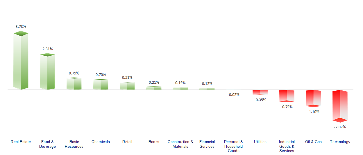 Although the session opened in the red due to the impact of U.S.–China tensions over the weekend, the VN-Index continued to reach a new all-time high by the end of the day, led by Vingroup stocks. The most positive sectors were Real Estate, Food & Beverage, and Chemicals, while the Technology group remained relatively subdued.