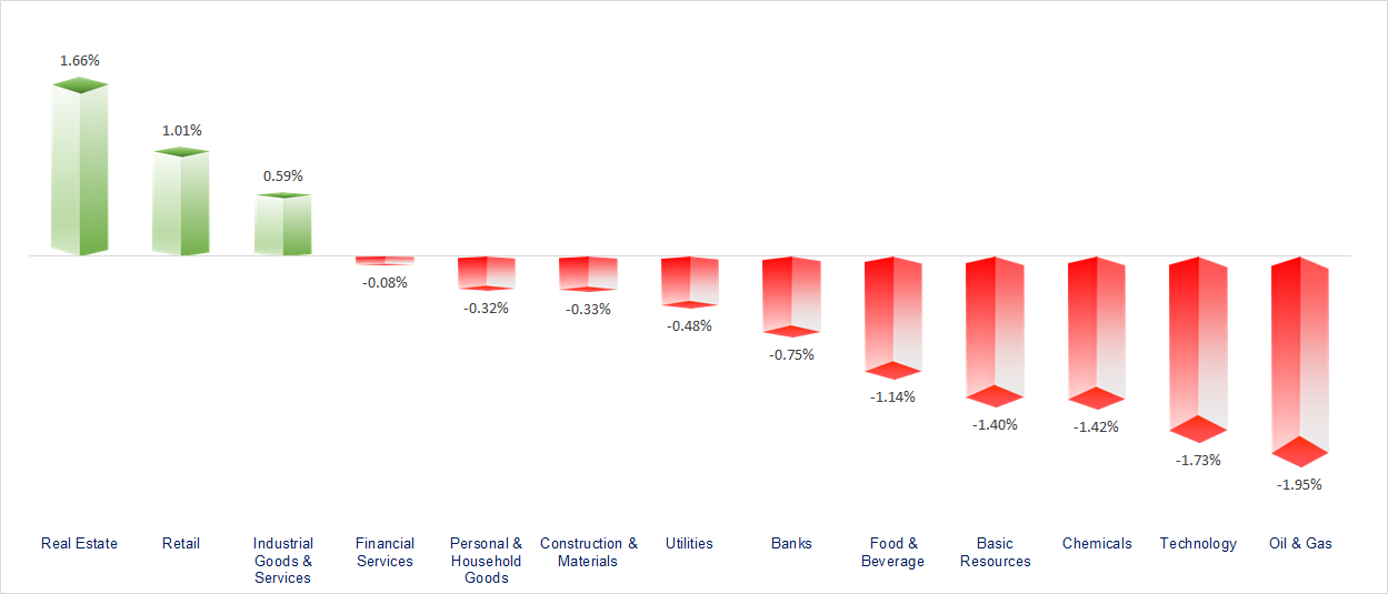 VN-Index recorded its first distribution session, with liquidity exceeding USD 2 billion. The Real Estate and Retail sectors were the strongest performers, while Oil & Gas, Technology, and Chemicals remained relatively weak.