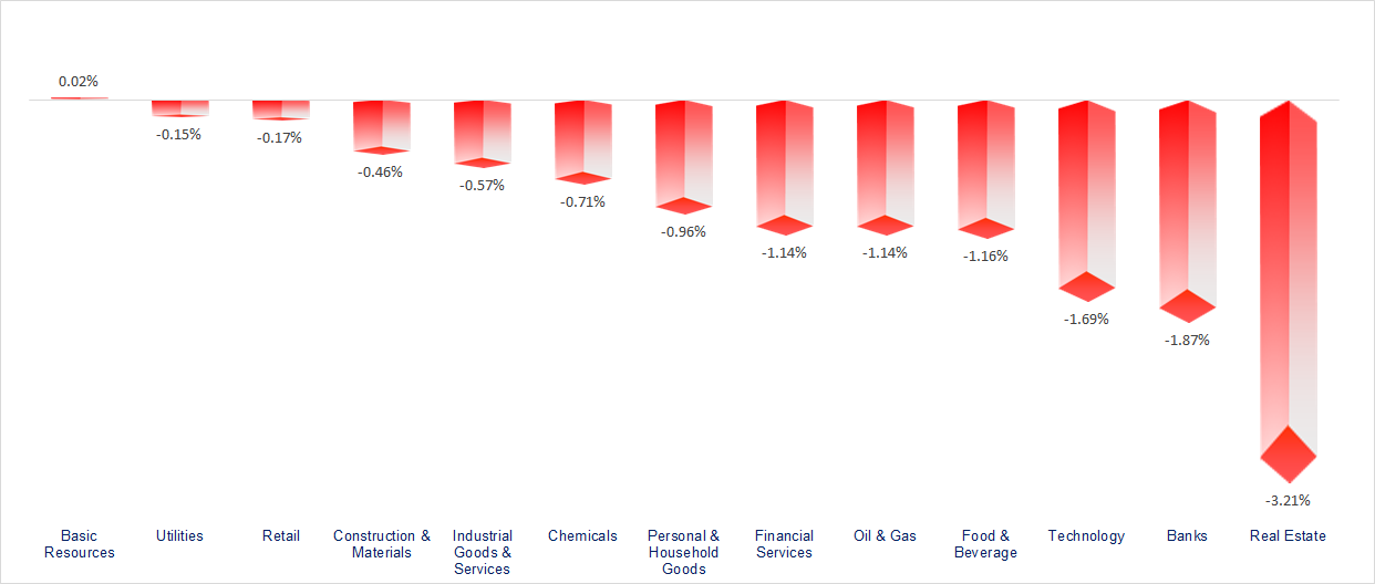 N-Index recorded its second distribution session, dropping more than 35 points due to strong correction pressure from Vingroup stocks. Most sectors ended the session lower, with Real Estate, Banking, and Technology being the most negatively affected groups.