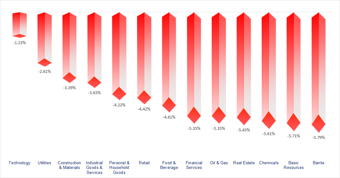 VN-Index experienced a record-breaking decline, losing nearly 95 points. Most sectors showed negative performance today, except for the group of Viettel-related stocks, which performed quite positively.
