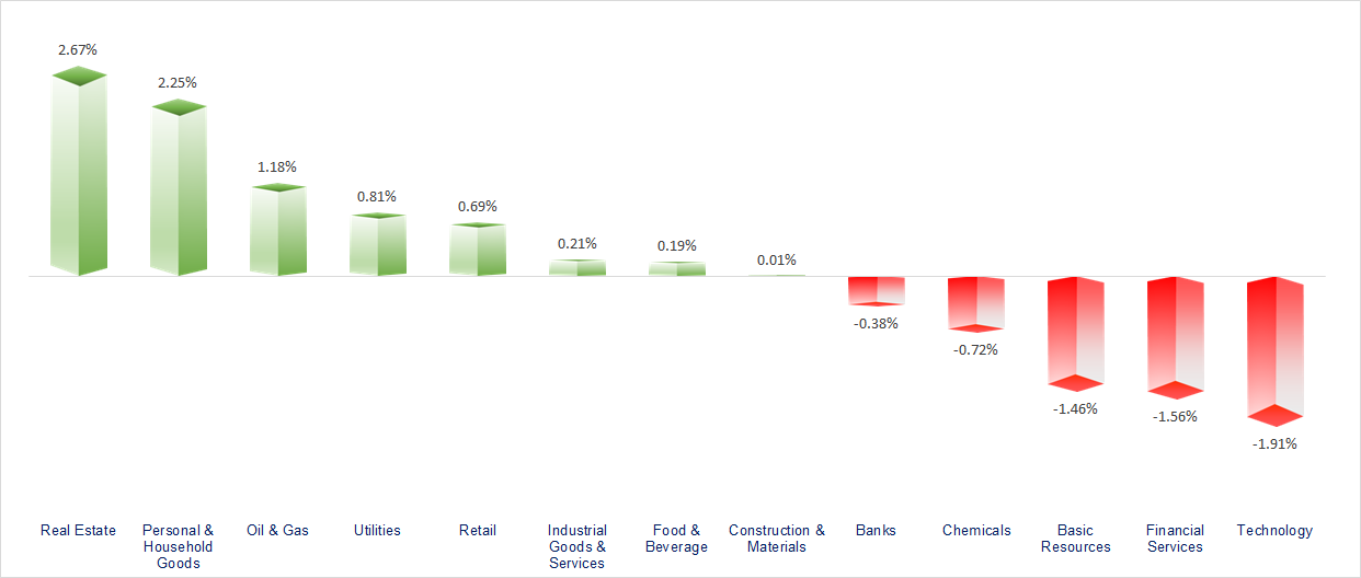 VN-Index continued its upward momentum, rising nearly 10 points as Vingroup stocks recovered, though market liquidity remained weak. The Real Estate, Oil & Gas, and Retail sectors led the gains, while Technology, Securities, and Chemicals showed lackluster performance.