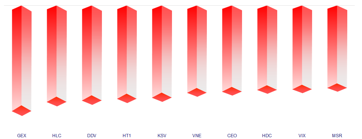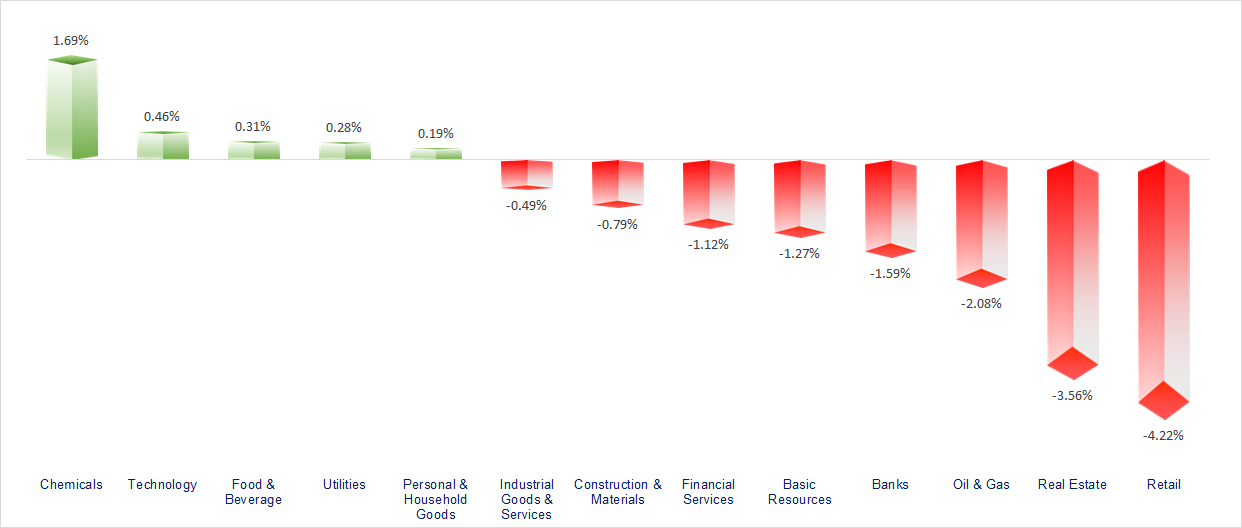 VN-Index fell sharply by more than 30 points, with Vingroup-related and real estate stocks hitting floor prices. The Technology and Chemicals sectors were the bright spots today, while Retail, Real Estate, and Oil & Gas showed notably weak performance.