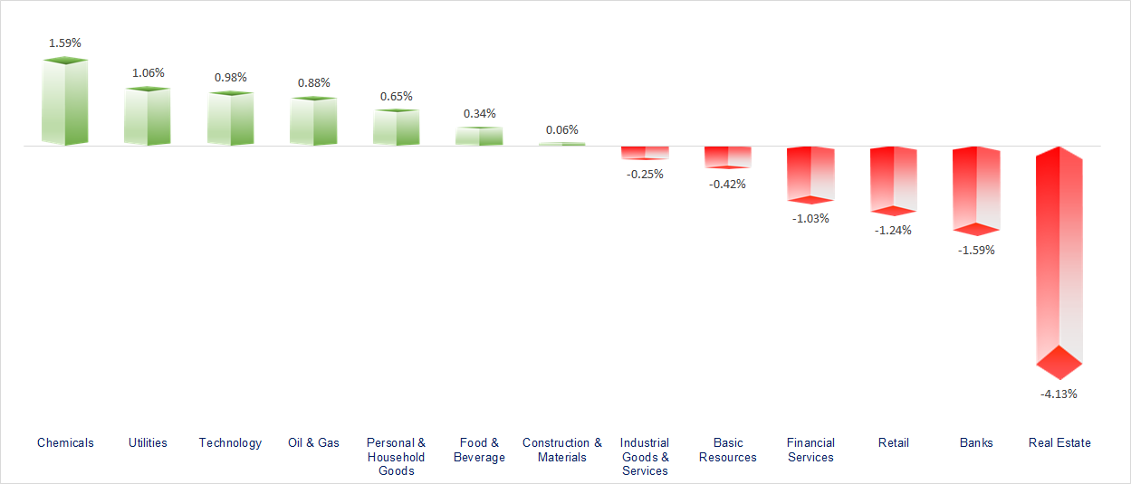VN-Index fell sharply by nearly 30 points, driven by late-session declines in Vingroup-related stocks and banking shares. The Chemicals, Technology, and Oil & Gas sectors were among the top gainers today, while Real Estate, Banking, and Retail sectors showed weak performance.
