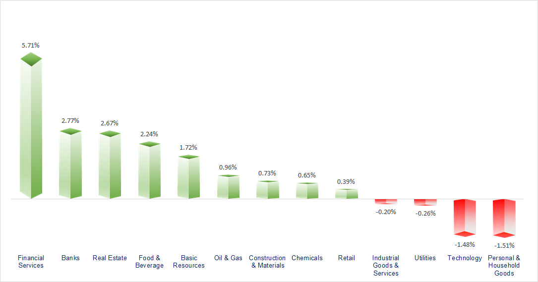 VN-Index surged strongly, driven by the rally in Securities and Real Estate stocks, alongside net foreign inflows of more than VND1,200 billion. Most industry groups gained points in today’s session, with Securities, Banking, and Real Estate standing out the most.