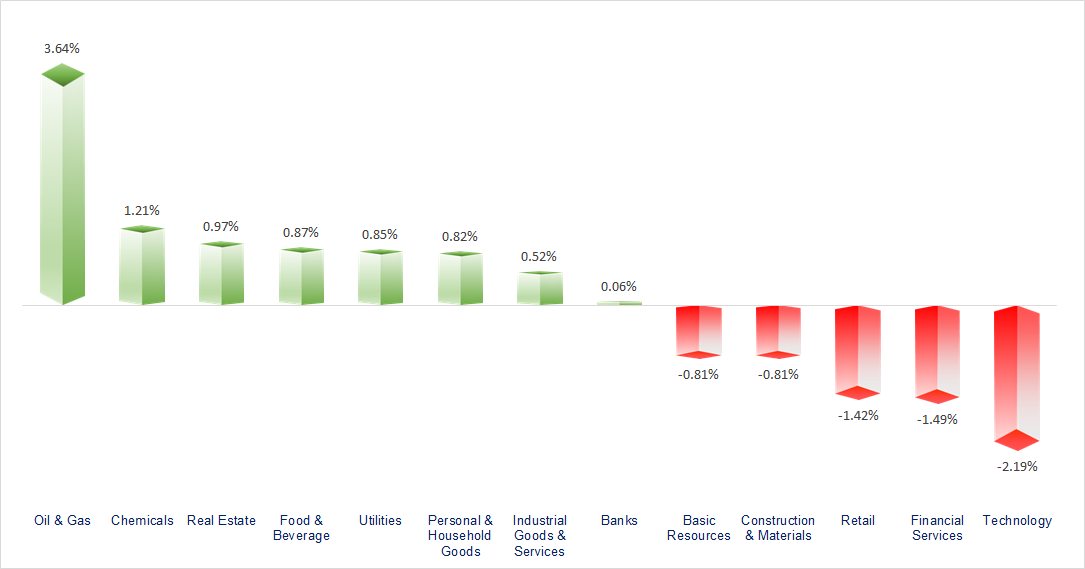 VN-Index continued to recover with support from state-owned enterprises, although liquidity dropped sharply to just over VND 20 trillion. Oil & Gas, Chemicals, and Real Estate were the most positive sectors in today’s market. In contrast, Technology, Securities, and Retail stocks showed rather lackluster performance.