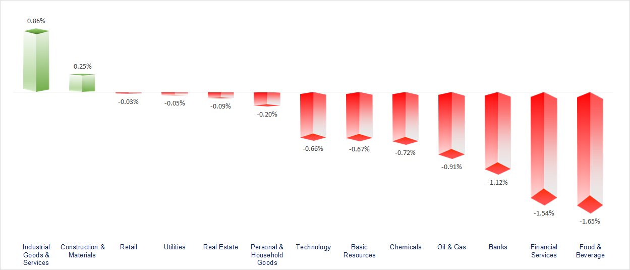 VN-Index experienced strong volatility in the last 30 minutes of the afternoon session as the Banking sector corrected, while market liquidity fell to a five-month low. Most sectors declined today, with the most negative performances coming from F&B, Securities, and Banking, while Industrial Services and Construction showed relatively positive momentum.