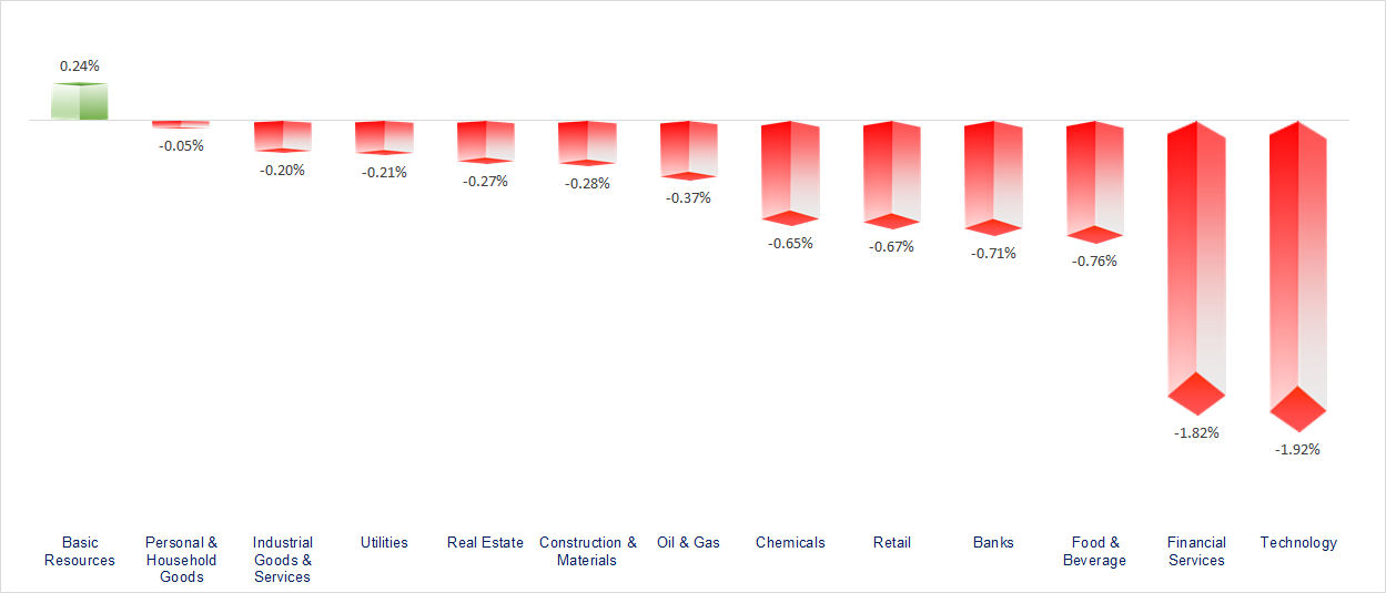 VN-Index lost more than 10 points as the Banking, Real Estate, and Securities sectors corrected. Most industry groups declined in today’s session, with the most negative being Securities, Banking, Retail, and Real Estate.