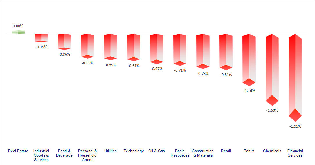 VN-Index reversed, dropping nearly 8 points as the brokerage sector fell sharply amid a spike in liquidity. Most sectors in the market posted losses, with the worst performers being Securities, Chemicals, and Banking.