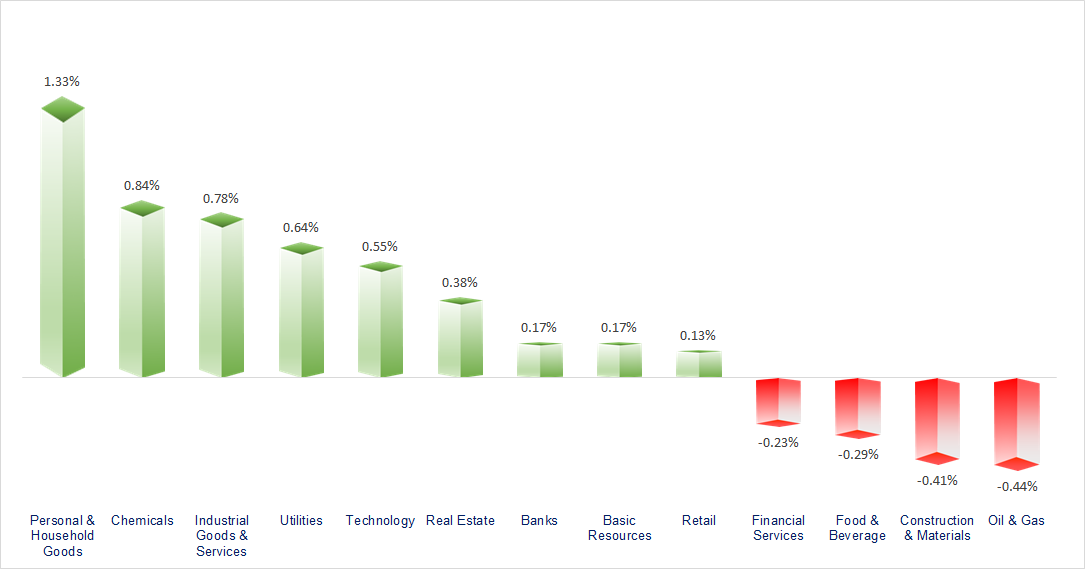 VN-Index ended the session in the green thanks to the positive performance of Banking stocks. Industrial Services, Chemicals, and Technology were the sectors that gained points today. In contrast, Oil & Gas, Construction, and Securities showed rather subdued movements.
