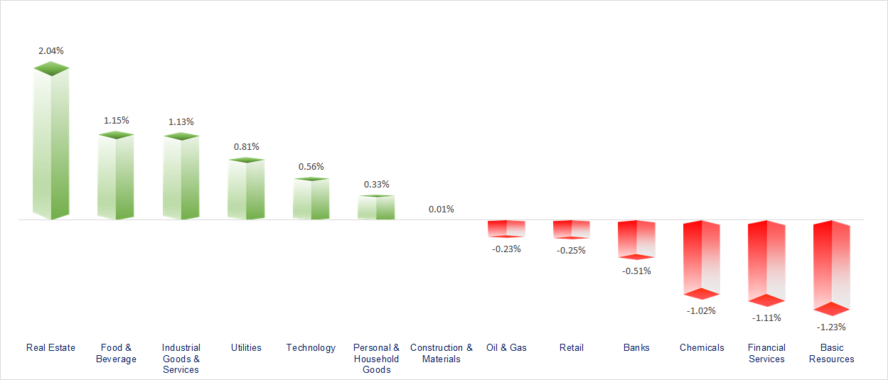 VN-Index continued to rise, though most sectors did not show truly positive performance. The Vin group and the F&B sector were the two standout gainers. Meanwhile, sectors such as Resources, Securities, Banking, and Oil & Gas showed rather lackluster movements.