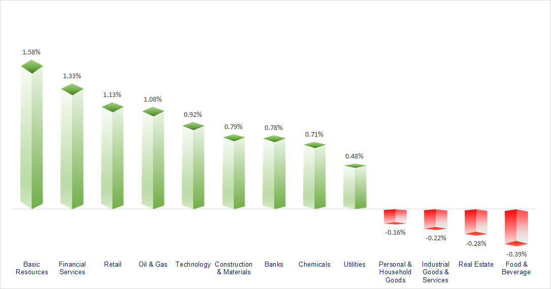 VN-Index recorded its seventh consecutive gaining session as liquidity continued to spread across various sectors such as Real Estate, Steel, and Securities. Many industry groups advanced today, with Securities, Steel, and Retail being the most positive performers. Meanwhile, the Vingroup ecosystem and F&B stocks saw rather lackluster movements.