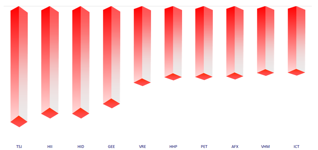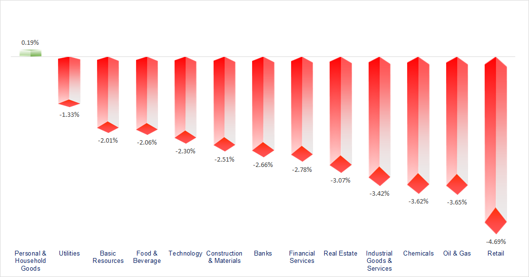 VN-Index saw a steep decline as a series of stock groups were suddenly dumped to the floor in the final 15 minutes of the session. In today’s market, most sectors fell, with Retail, Oil & Gas, and Chemicals being the most negatively affected groups.