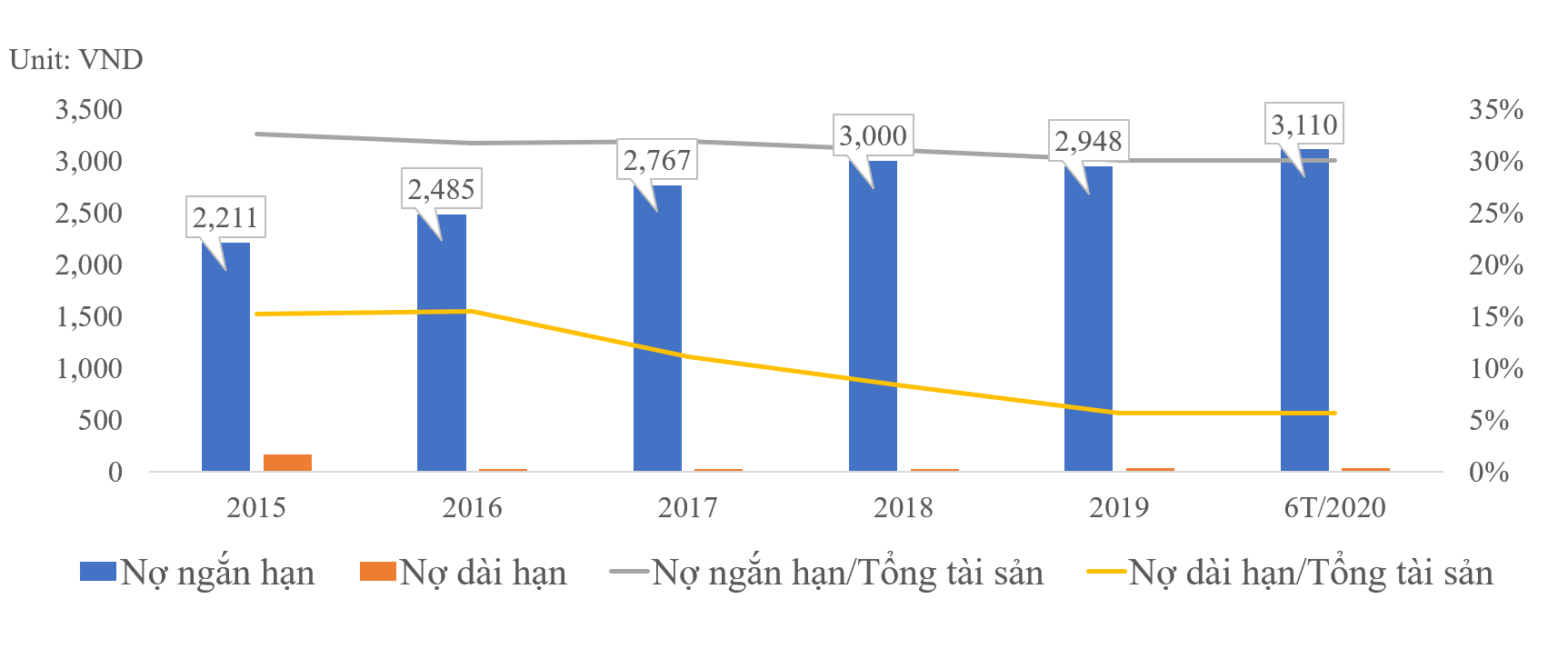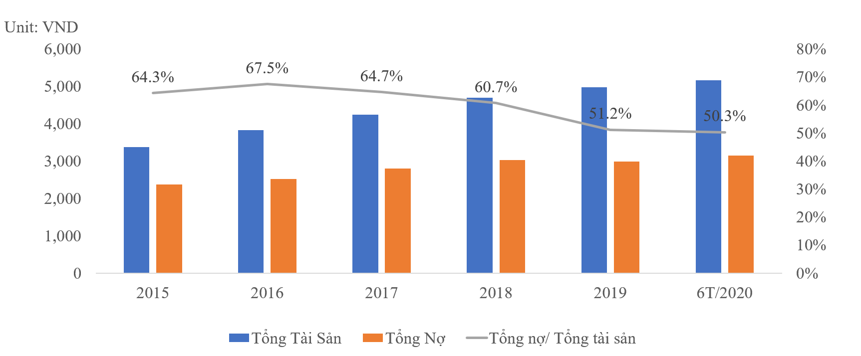 Tổng tài sản đạt hơn 5100 tỷ, tăng theo từ 10-14%, trong đó nợ chỉ tăng nhẹ, ở mức 8%. Tổng nợ/tổng tài sản khá cao so với các doanh nghiệp cùng ngành, nhưng nợ ngắn hạn và nợ dài hạn chỉ chiếm 35% còn lại là do chính sách kinh doanh của công ty khiến các khoản mục phải trả, phải thu chiếm tỉ trọng lớn trên tổng tài sản.