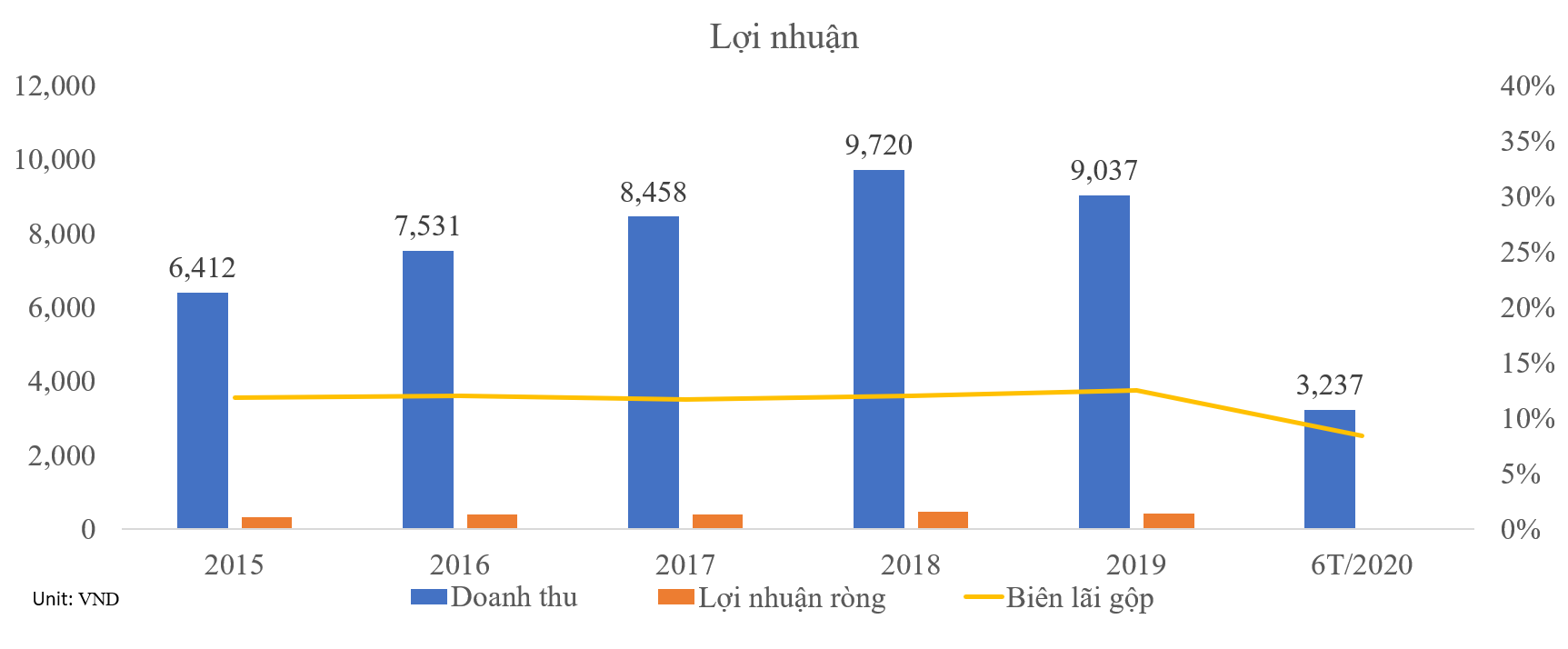 Từ 2016-2018, lợi nhuận mỗi năm đều tăng trưởng tốt, mỗi năm tăng từ 1000-1300 tỷ đồng, riêng 2019 giảm nhẹ, với doanh thu đạt 9000 tỷ.