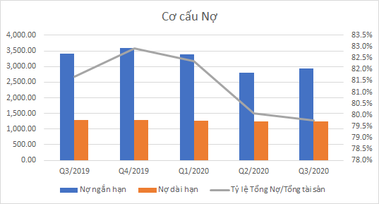 Công ty có tỷ lệ vay nợ khá cao với tỷ lệ Tổng nợ/Tổng tài sản chiếm đến 80% và Nợ/VCSH lên đến gần 4 lần. Tuy nhiên, trong 4.176 tỷ đồng cơ cấu Nợ của công ty tại ngày 30/09/2020 thì có đến 1.314 tỷ đồng là khoản Người mua trả tiền trước cho dự án B6 Giảng Võ, còn lại là Phải trả người bán với 1.034 tỷ đồng và Nợ dài hạn 1.234 tỷ đồng. Tỷ lệ Nợ ngân hàng/Tổng tài sản chỉ chiếm 20,3%.
